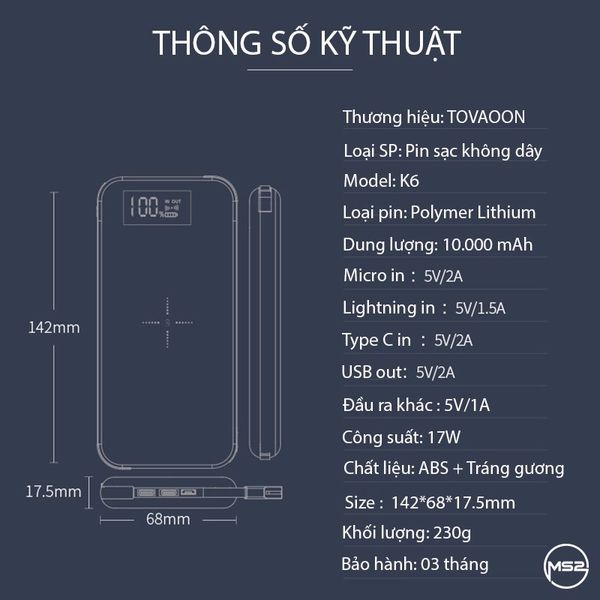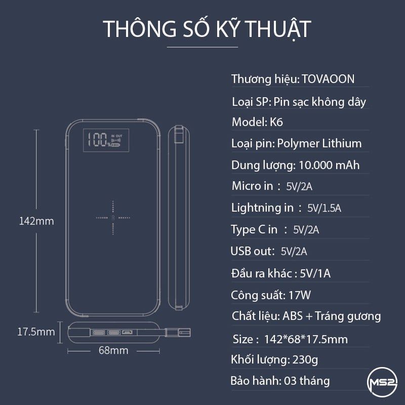 PIN SẠC DỰ PHÒNG KHÔNG DÂY TOVAOON K6 10.000 MAH - SẠC 4 THIẾT BỊ CÙNG LÚC KHÔNG CẦN CỔNG CHUYỂN