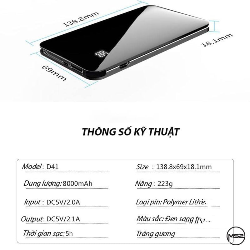 ☑ Không còn những bất tiện với những chiếc pin sạc cồng kềnh và nặng nề. Với thiết kế tinh tế, thời trang mặt trước tráng gương chịu lực, mặt sau hợp kim nhôm siêu bền cùng màn hình LED HD hiển thị chính xác % pin còn lại. Sản phẩm là sựa lựa chọn tốt nhất cho các tín đồ thời trang và tiện ích.