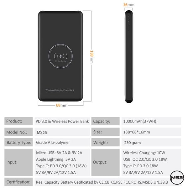 Note: Vì sản phẩm là pin dự phòng, Quý khách mua về sử dụng hạn chế vừa cắm input cho pin vừa đặt điện thoại để sạc không dây! Sẽ giảm tuổi thọ của pin và sản phẩm.