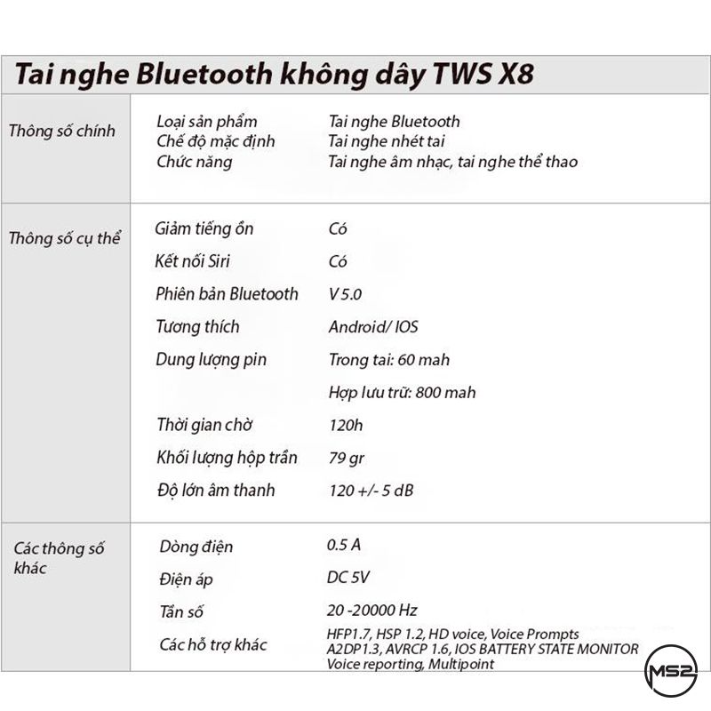- Ra mắt nửa cuối năm 2018, Tai nghe Bluetooth TWS X8 là dòng sản phẩm tai nghe trung cấp được Macstore24h chính thức phân phối. Với thiết kế tinh tế hộp sạc kim loại trụ tròn sang trọng cùng chất lượng âm thanh trung thực rõ nét. Đây thực sự là dòng sản phẩm đã gây ra cơn sốt thị trường nửa sau của năm 2018 so với những dòng sản phẩm tương tự.